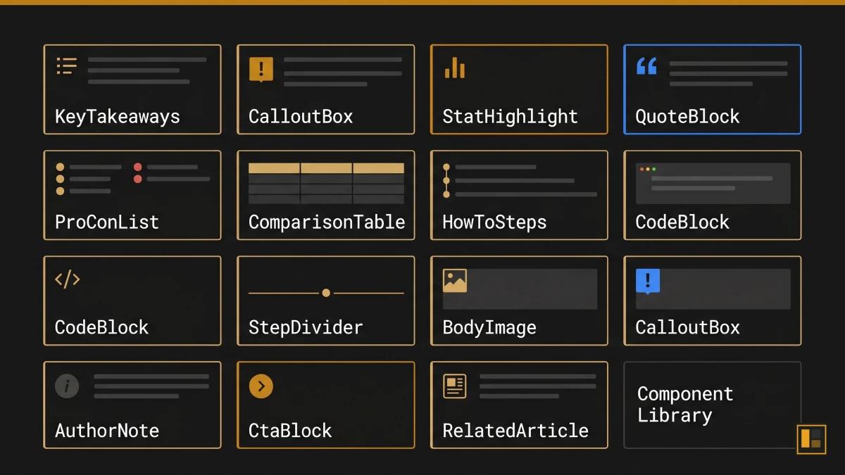 - Required components: HowToSteps, CodeBlock (if technical), CalloutBox (tip), CtaBlock (lead-magnet or newsletter)