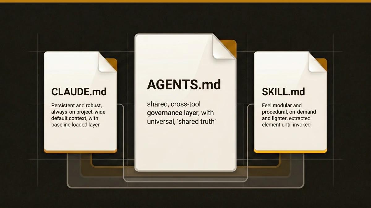 The solution is straightforward once you understand what each file is designed for. CLAUDE.md holds project-wide facts that Claude Code should know every session. AGENTS.md holds universal rules that every AI tool should follow. SKILL.md holds task-specific procedures that load only when you need them. Each file has a purpose, a loading cost, and an audience. Putting the right content in the right file saves tokens, eliminates drift, and makes every tool on your team work from the same source of truth.